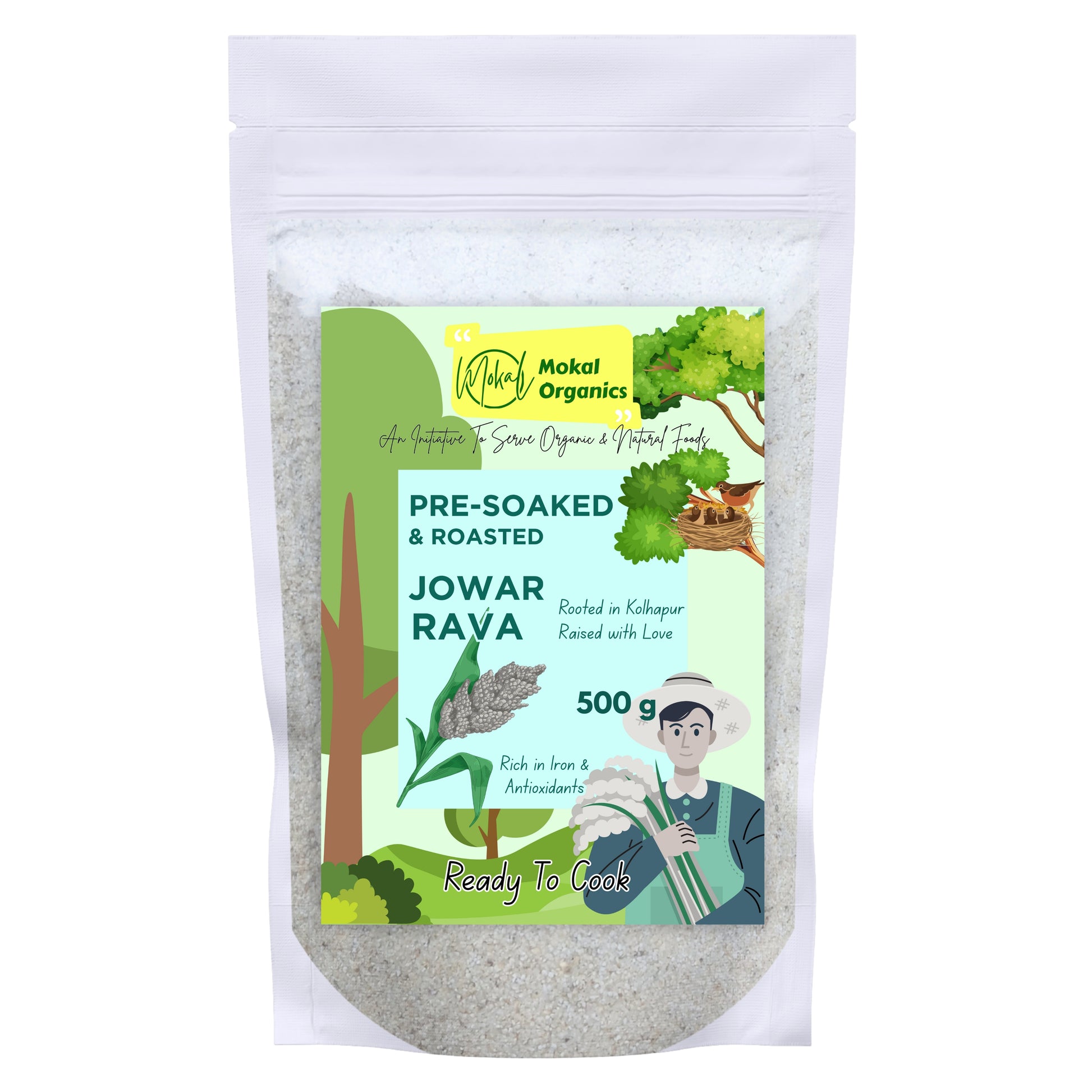 Mokal Organics Jowar Rava is made from premium jowar grains sourced from Kolhapur, Maharashtra. Soaked for 12 hours, then sun-dried to retain nutrition, it's naturally gluten-free, high in fiber and iron—perfect for rotis, bhakris, dosas, and more. Supports digestion, energy, and a balanced diet.