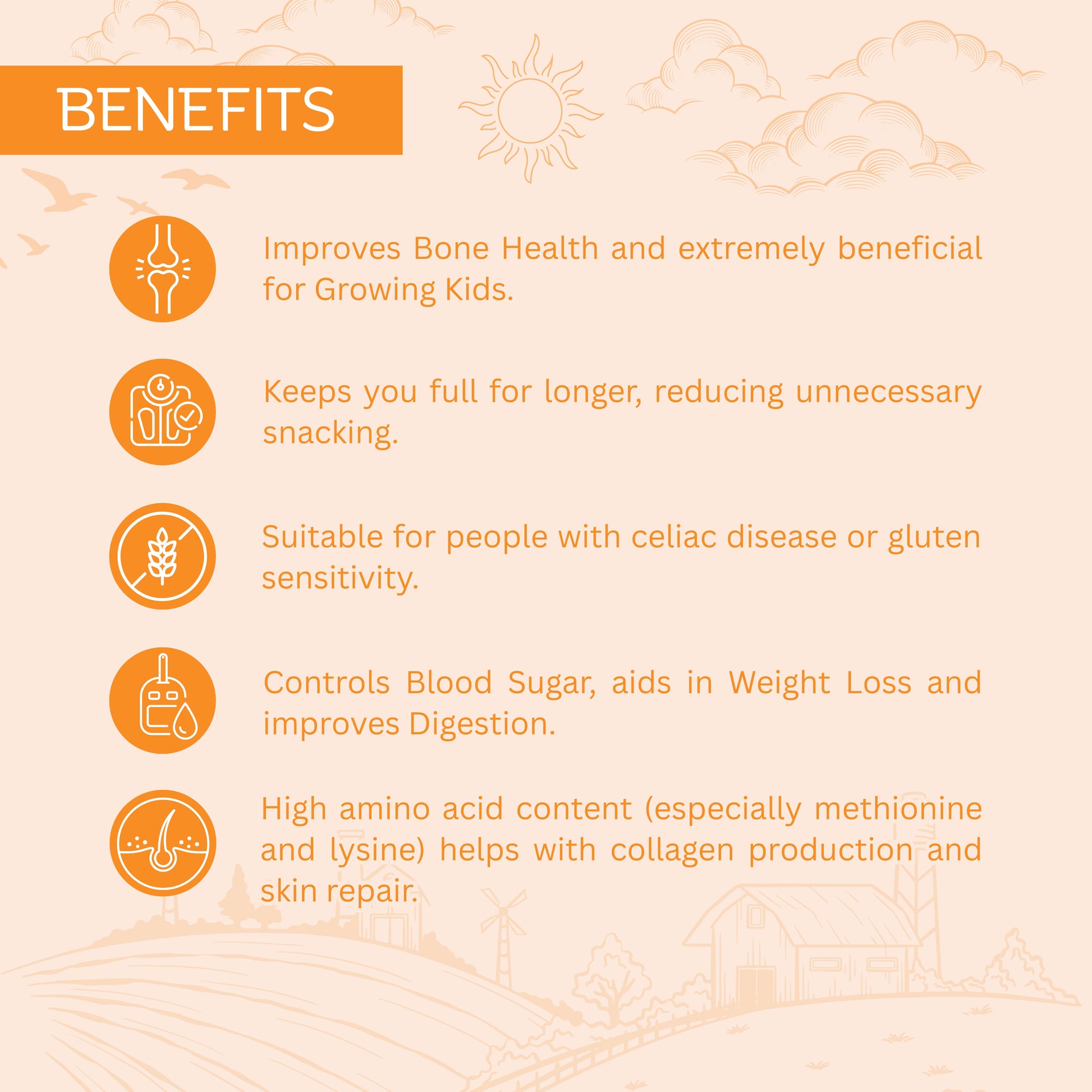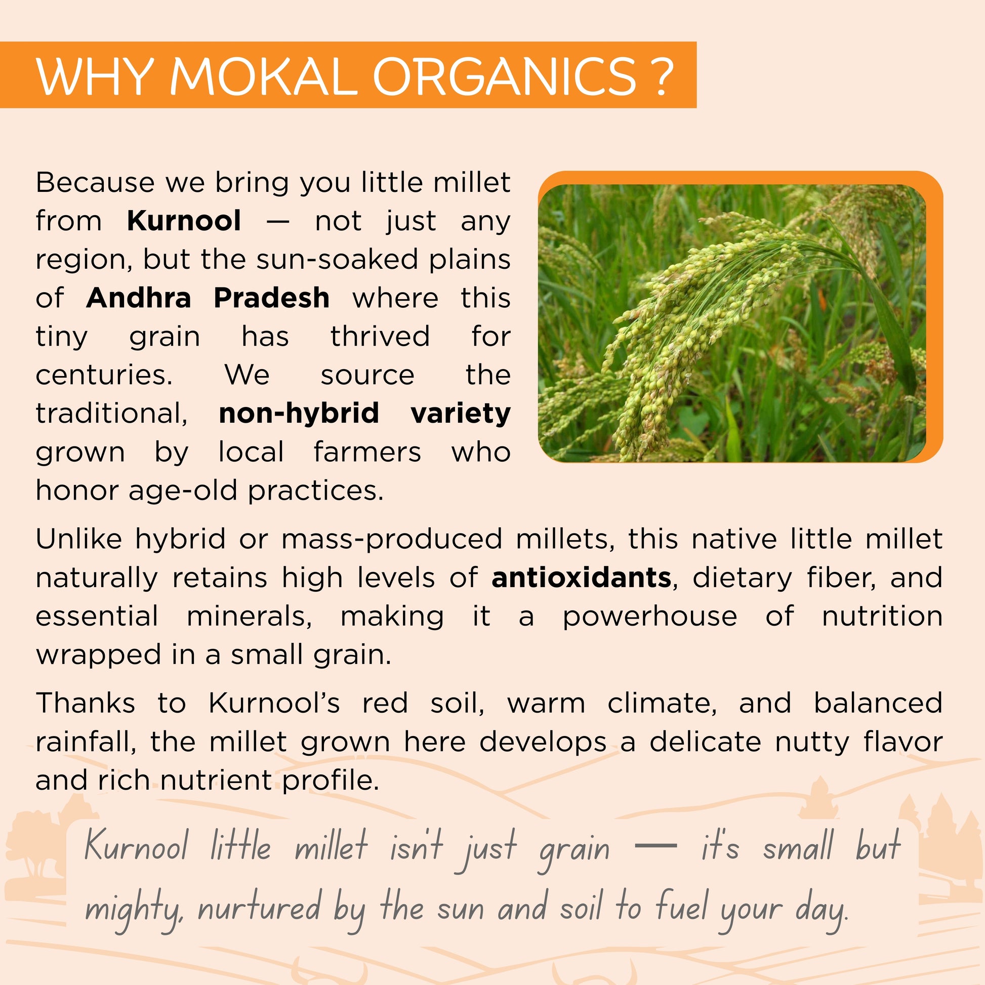 Mokal Organics Little Millet is sustainably grown in Kurnool, Andhra Pradesh, using traditional dryland farming. Soaked for 12 hours, sun-dried, and lightly roasted, it retains its natural aroma and nutrients. Rich in fiber and plant protein, it supports digestion, energy, and clean, conscious eating.