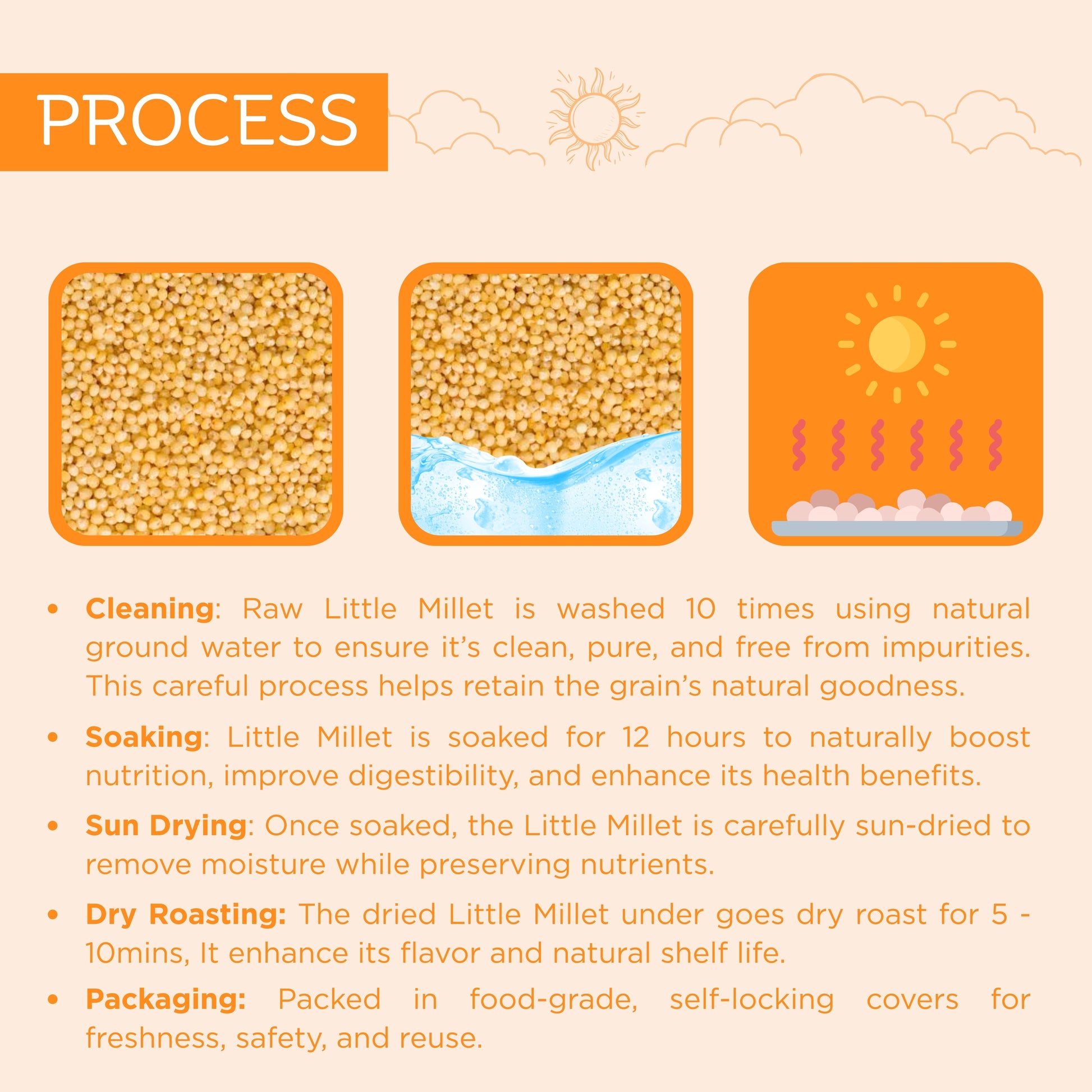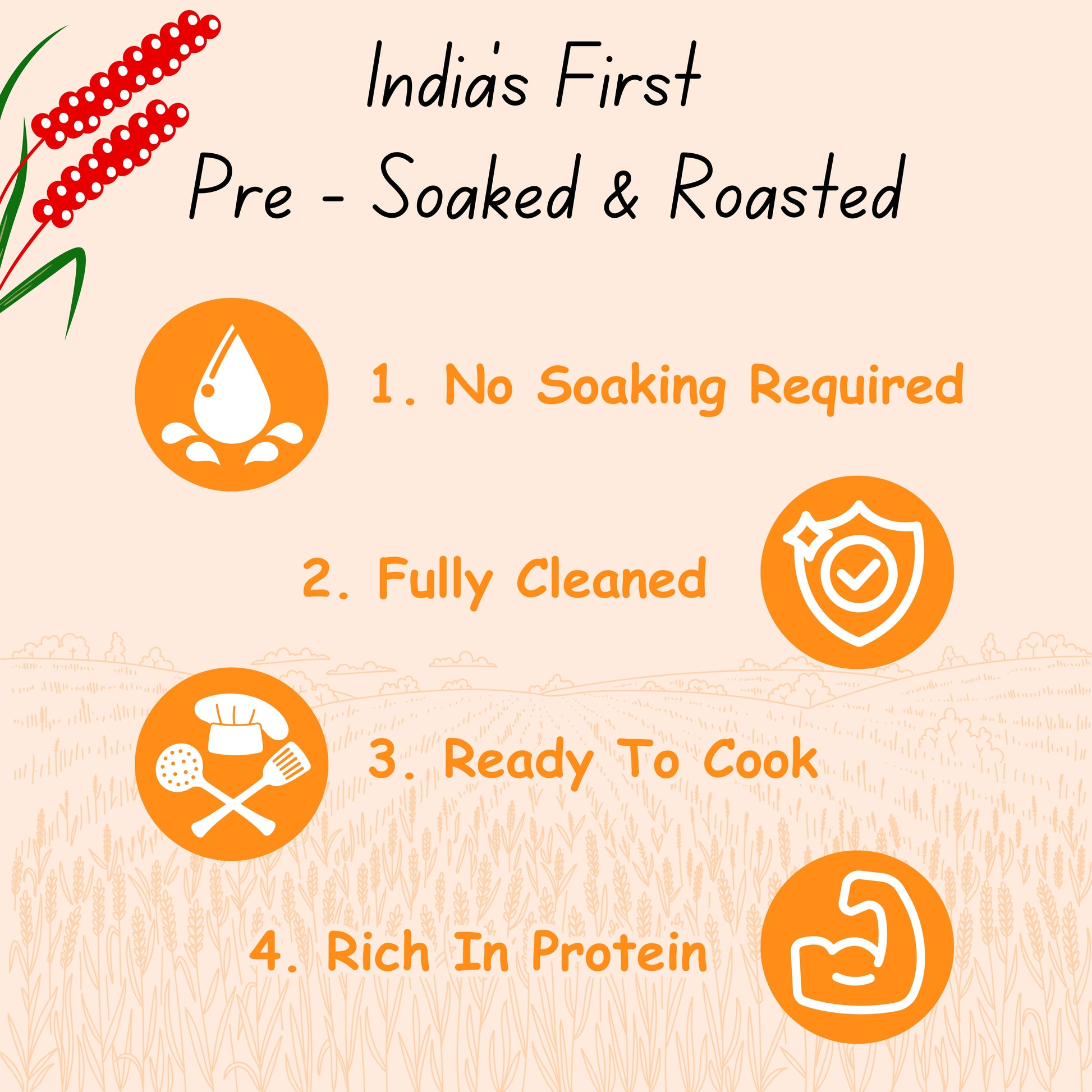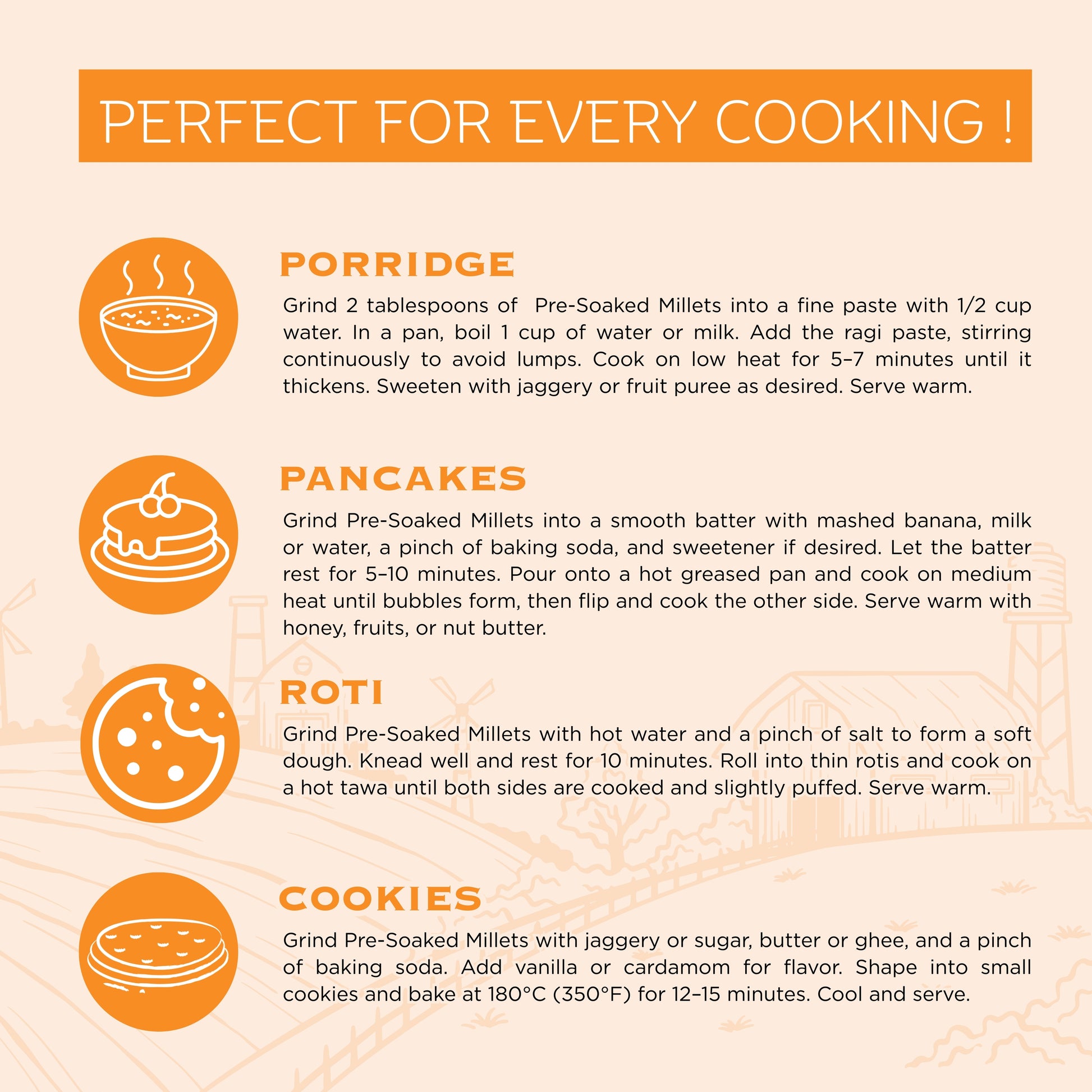 No soaking is required! Our millets are pre-soaked for 12 hours, sun-dried, and minimally roasted — making them ready to cook instantly. This traditional yet time-saving process helps retain natural nutrients and flavor while reducing cooking time to just 7 minutes. Simply rinse and cook like rice for a healthy, quick meal.