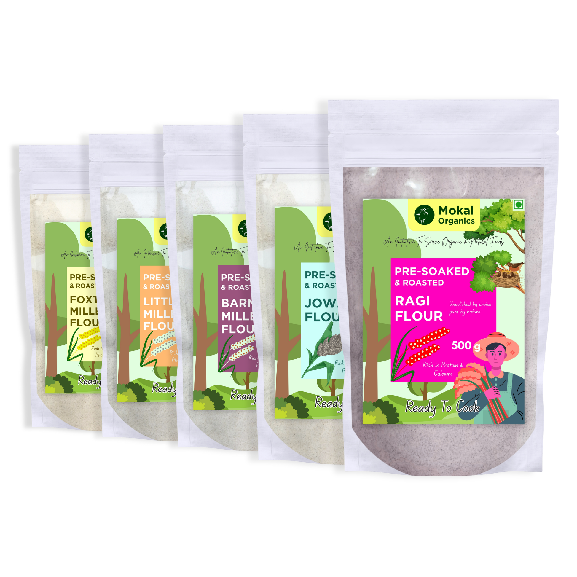 Pre-Soaked Millet Flours 2.5Kg ( Ragi, Jowar, Foxtail, Little, Barnyard ) 500g Each | Unpolished Millet Flours | Positive Millet Flours