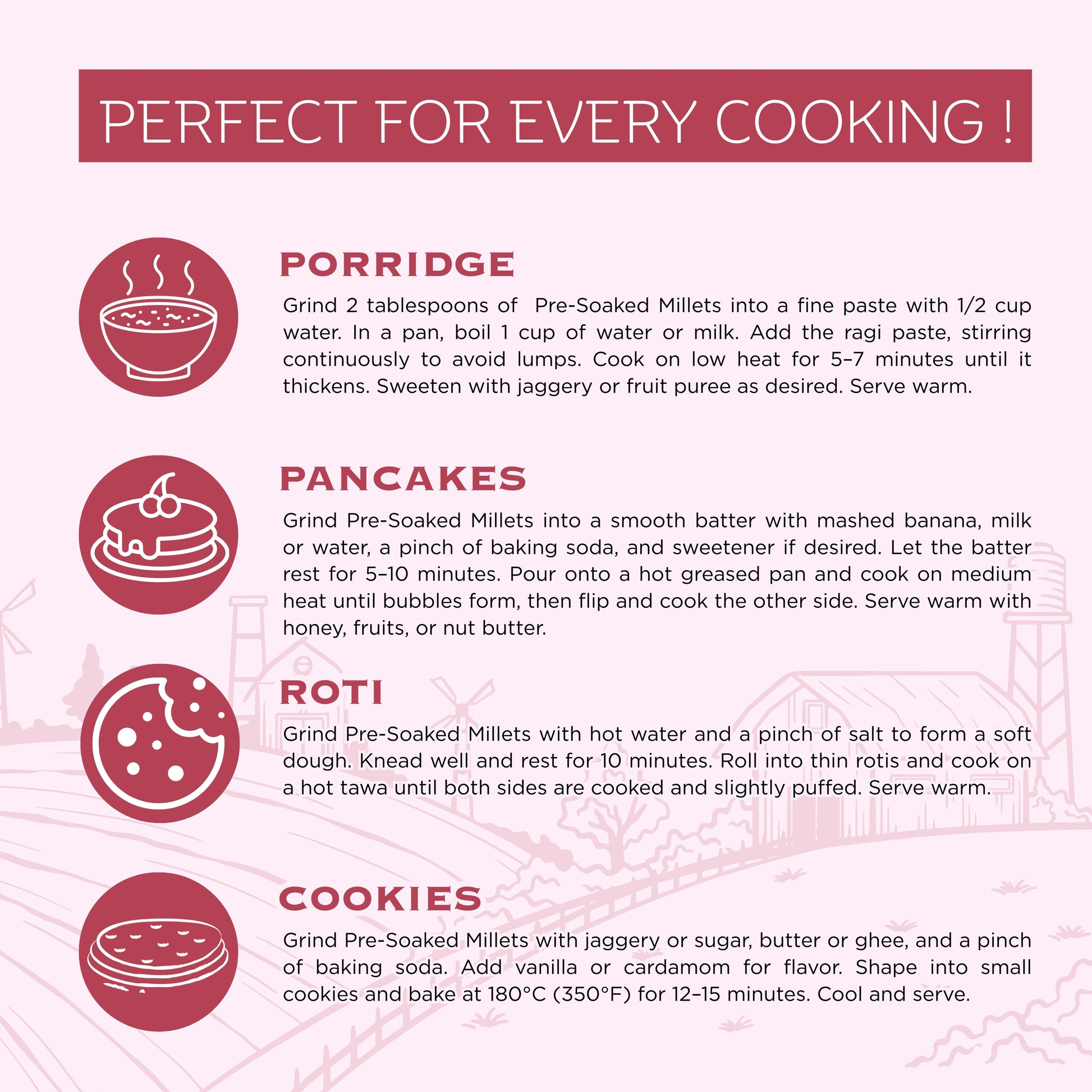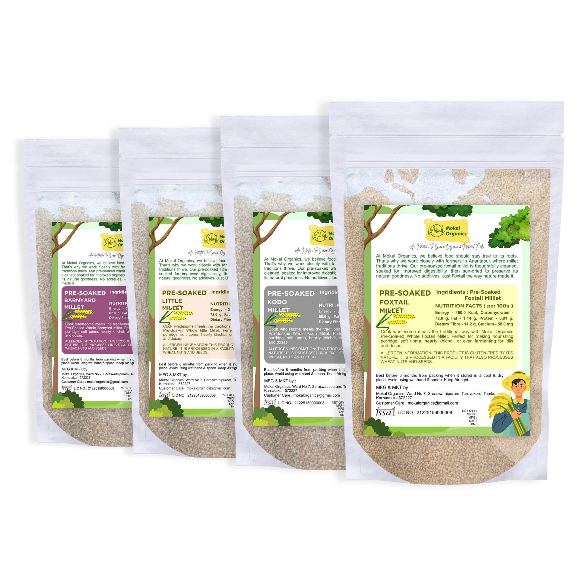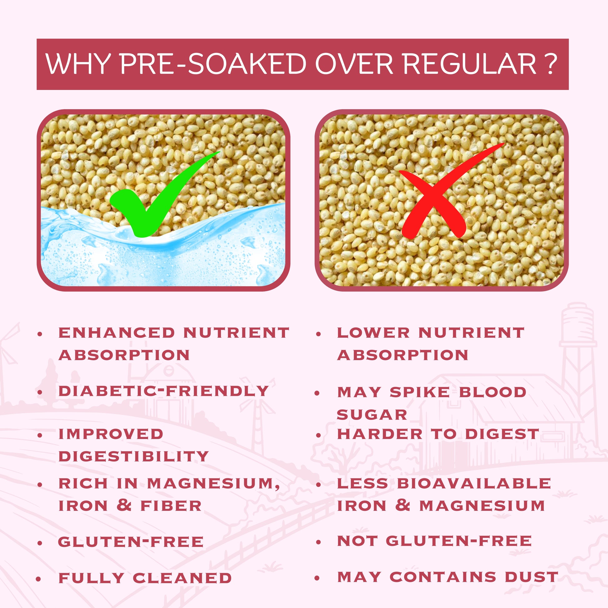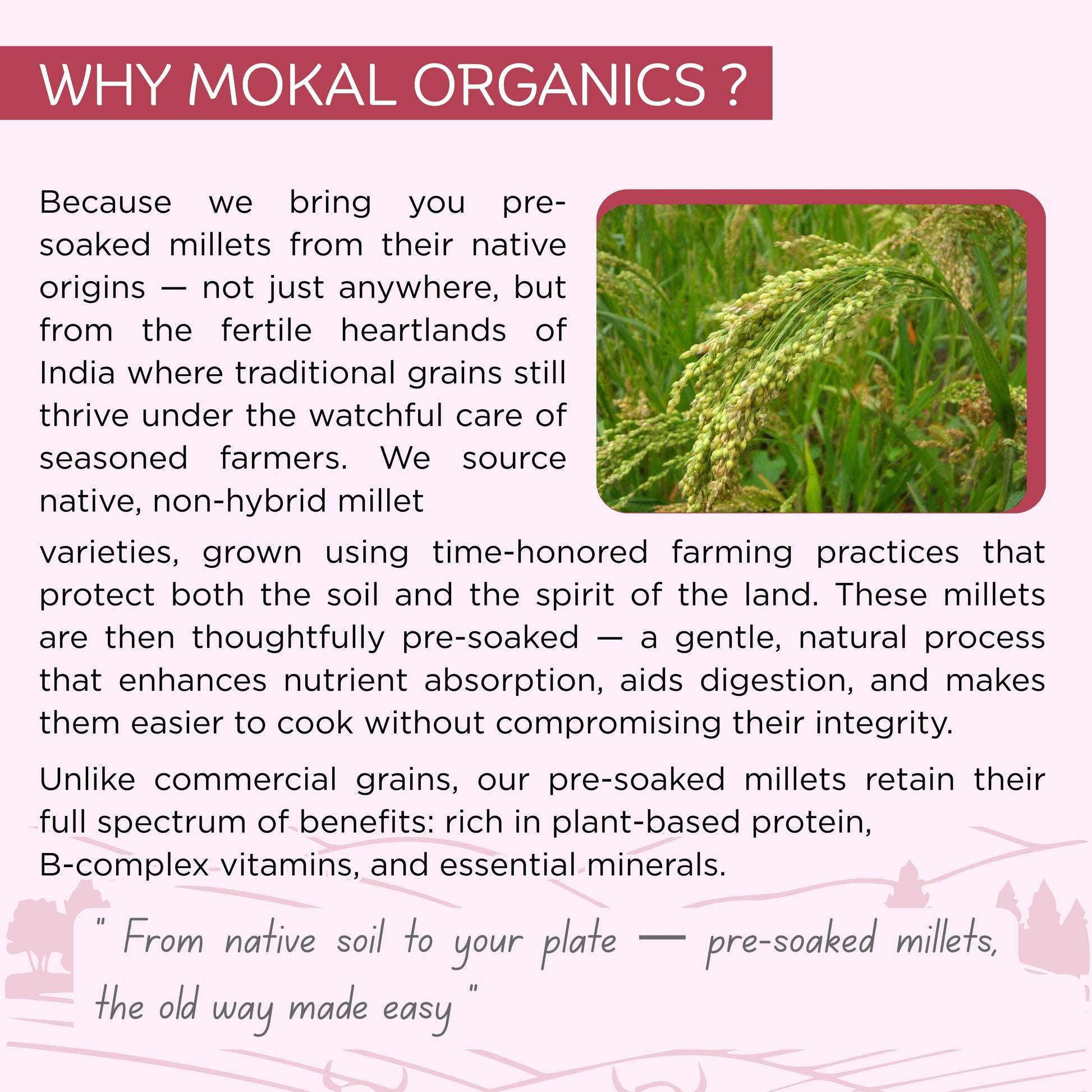 No soaking is required! Our millets are pre-soaked for 12 hours, sun-dried, and minimally roasted — making them ready to cook instantly. This traditional yet time-saving process helps retain natural nutrients and flavor while reducing cooking time to just 7 minutes. Simply rinse and cook like rice for a healthy, quick meal.
