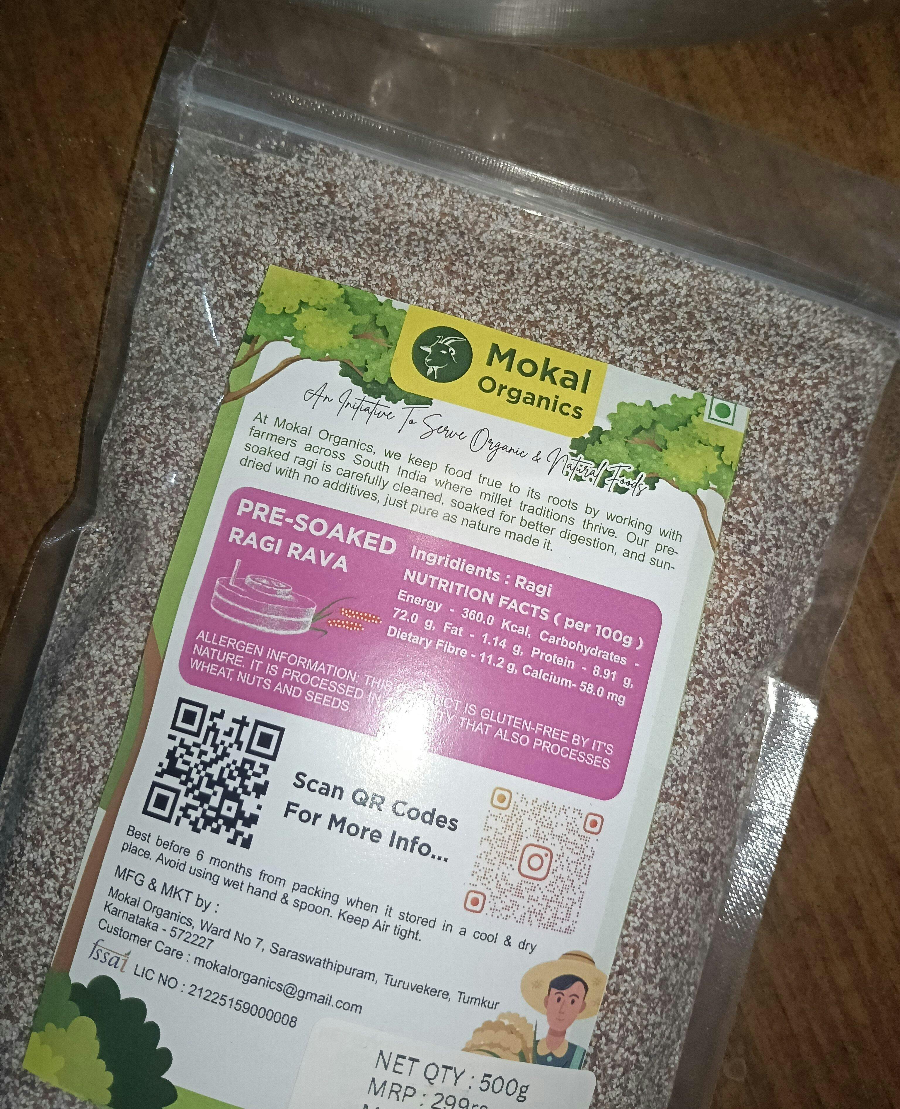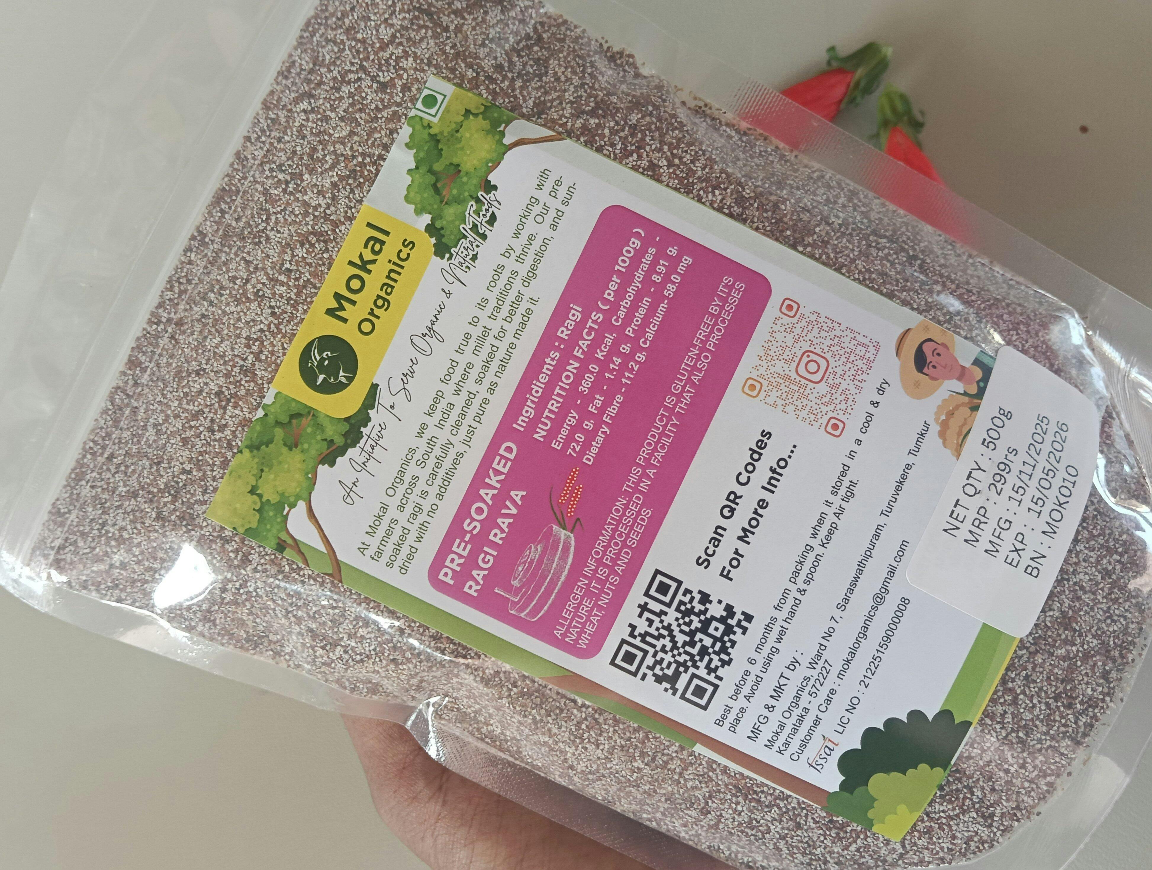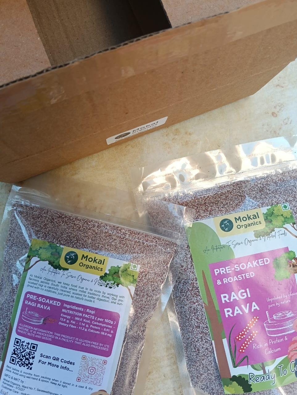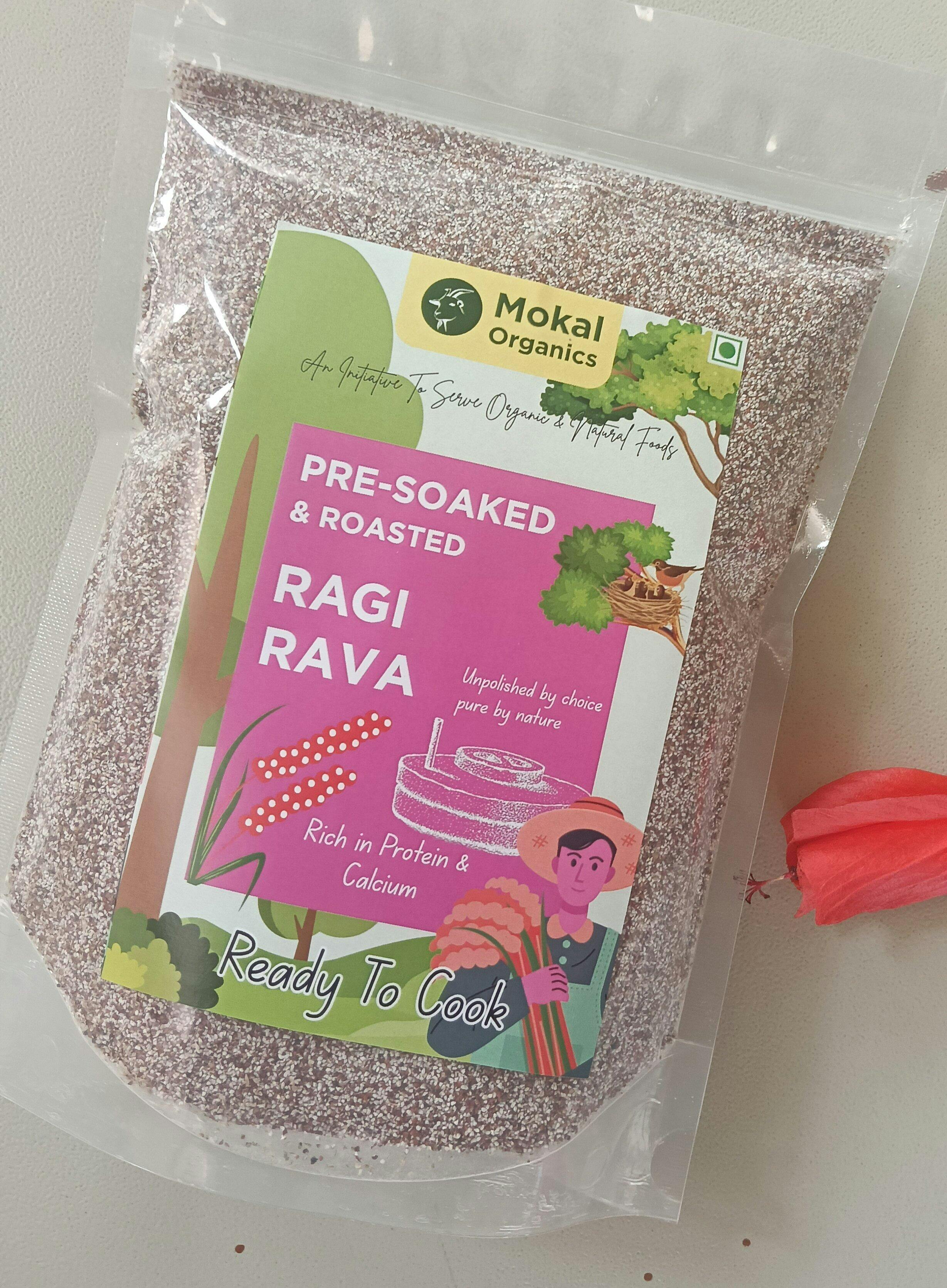 Pre-soaked ragi rava (finger millet rava) made from native South Indian ragi, carefully selected for purity, flavour and nutritional value. The ragi grains are soaked for 12 hours to naturally reduce anti-nutrients and support better digestion, then sun-dried for 3 days to enhance aroma and retain their natural goodness. They are lightly roasted and traditionally stone-ground to preserve natural fibre, calcium-rich minerals and authentic texture. Soft, aromatic and easy to digest, this healthy ragi rava is ideal for making upma, idli, dosa, porridge and baby food, offering clean, traditional and nutritious food for everyday meals.